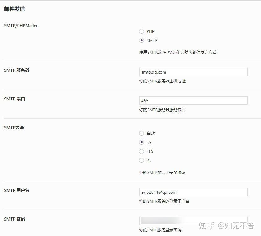 上图是我主题内置的SMTP发信服务的配置面板,我们可以根据红色的提示文字进行配置: